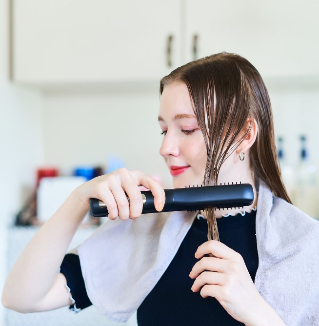 ブライトモードをONにして髪をとかすように仕上げると、YA-MAN独自の美顔器テクノロジーを応用した電気の力で、瞬時になめらかな髪を生み出します。
